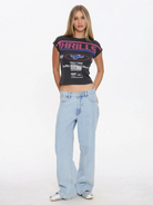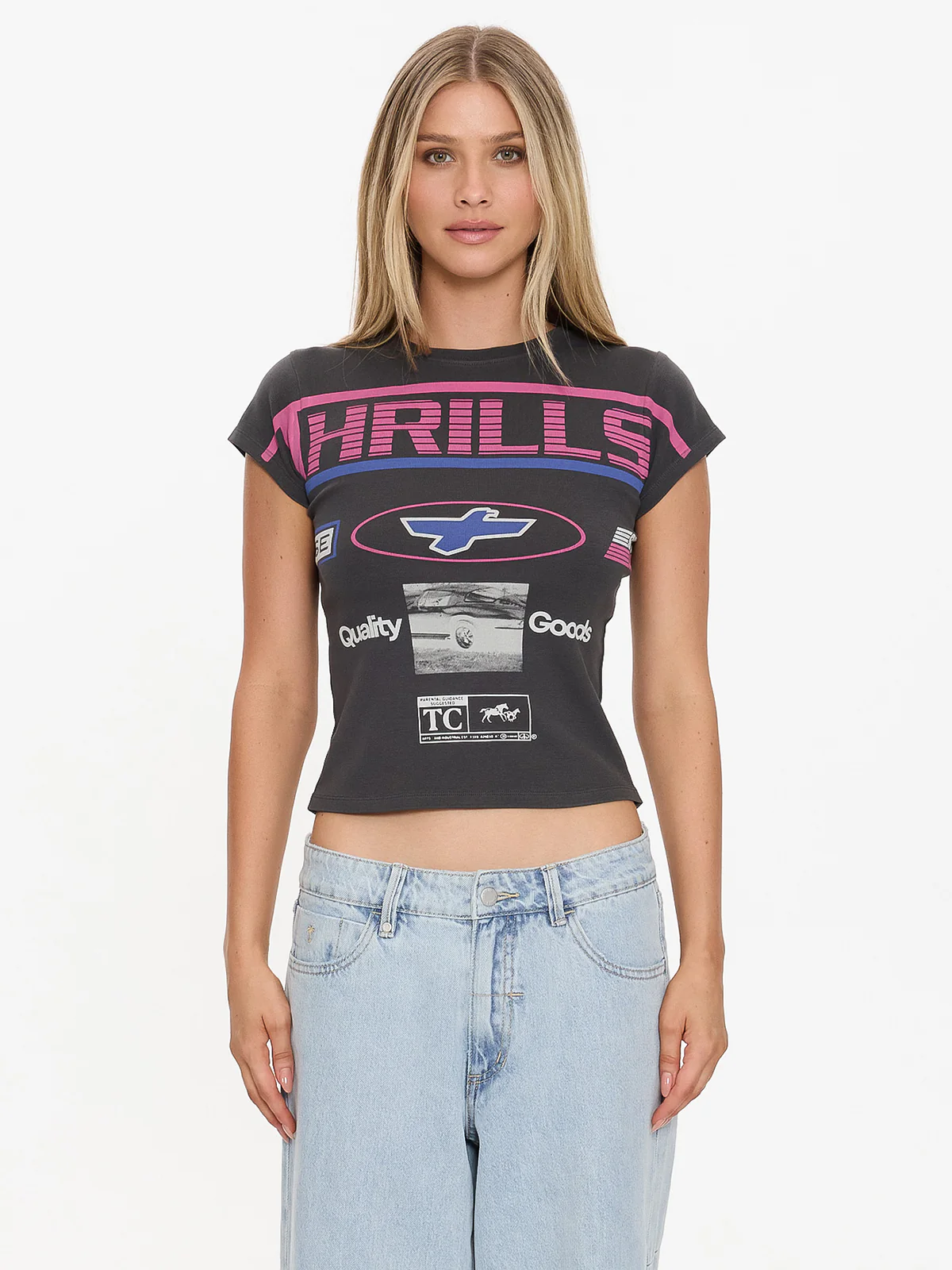 Rev up your summer rotation with the Speed Kills Club Tee in Merch Black. Featuring bold racing-inspired graphics finished with exaggerated Thrills typography, this slim-cut tee is built for statement dressing with a nod to vintage merch fits. Made from a stretchy blend of cotton and elastane, it delivers structure and a close fit that flatters while staying comfy. Wear it with low-rise baggy denims for that effortless style or layer under a button box fit t shirt au for a tougher streetwear edge.