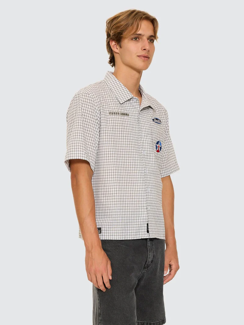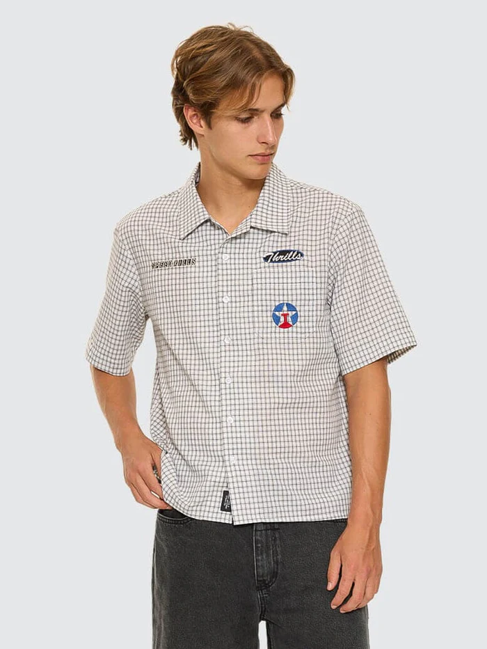 Workwear attitude meets modern streetwear in the Super Charged Short Sleeve Cropped Check Work Shirt in White. Crafted from a breathable blend of cotton and linen yarn dye check, this piece from our men's shirts AU selection is lightweight yet structured, making it an easy favourite for layering and everyday wear. The cropped cut and boxy silhouette give it a progressive edge, while the subtle motorsport-inspired patches nod to ThrillsÕ high-octane influences. A versatile staple in men's fashion AU-style, this button shirt balances vintage workwear roots with a shorter, modern fit.