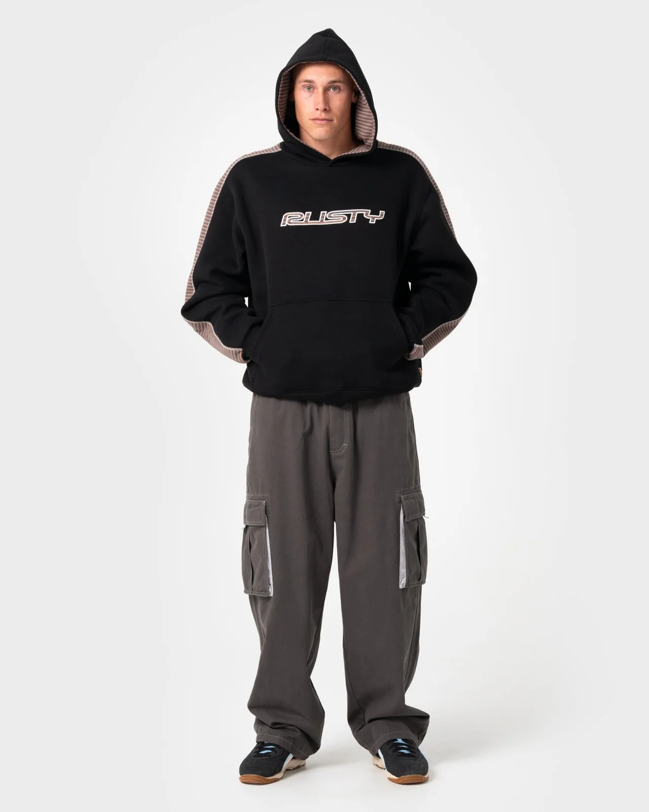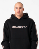 Relaxed R2K Fit Hooded Fleece Striped Panel And Rusty Applique On Chest. 58% Polyester / 42% Cotton Fleece (After Wash)