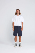 The Chippy Short has Thing Thing tack buttons, riveted pockets, a contrast inner waistband, and print on the back pocket opening and inside waistband.