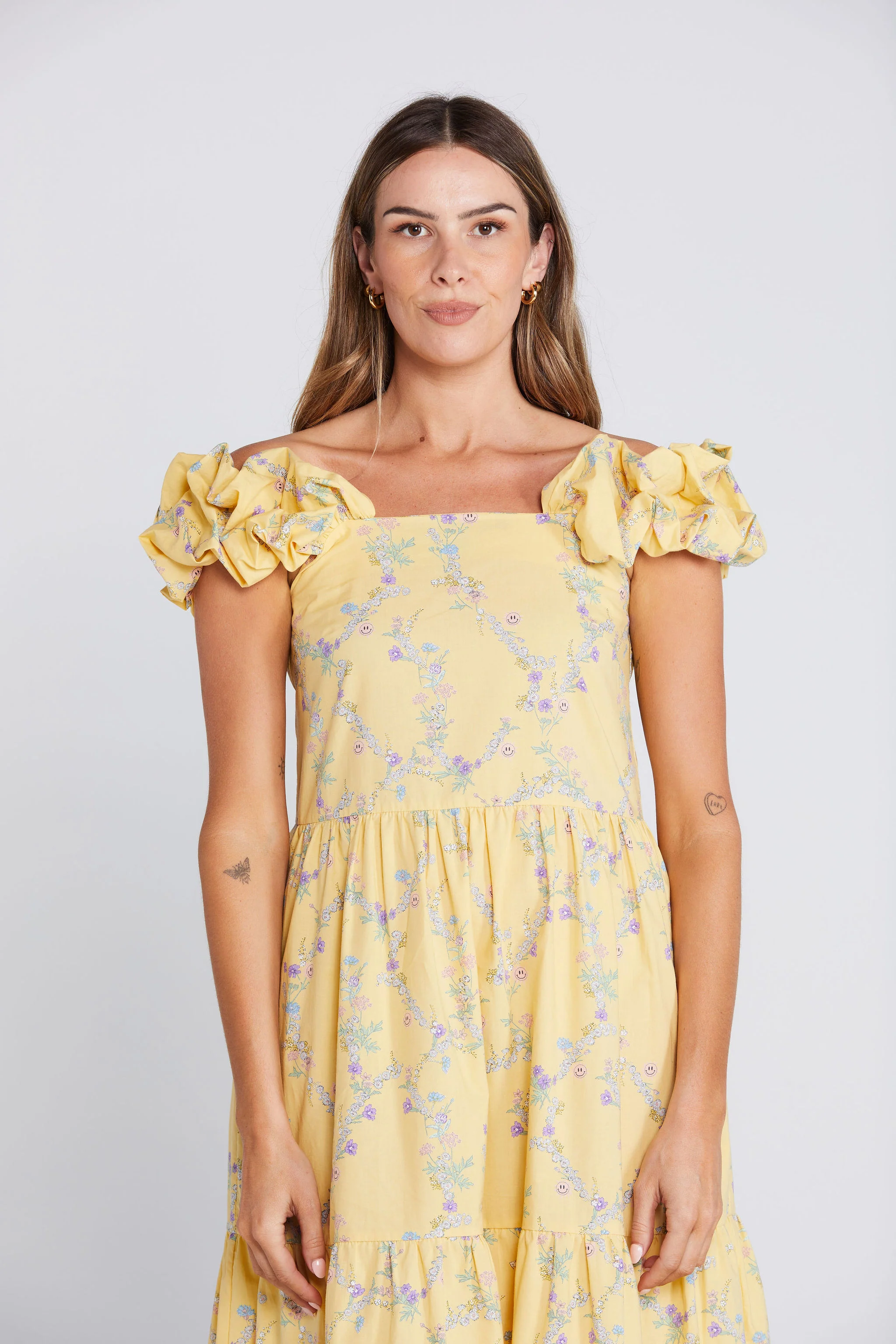 The Ziggy Ruffle Dress takes everything you love about the original Ziggy Dress and adds playful ruffle gathered shoulder straps. Featuring a bit of shirring in the back and the same tiered design and pockets, it's a total win-win. The sweet floral print features a tiny sunny smile to brighten your day.