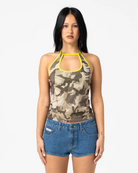 Halter Top With Contrast Binding - Front Keyhole Detail And Devil Metal Trim Trinket. 100% Polyester Mesh