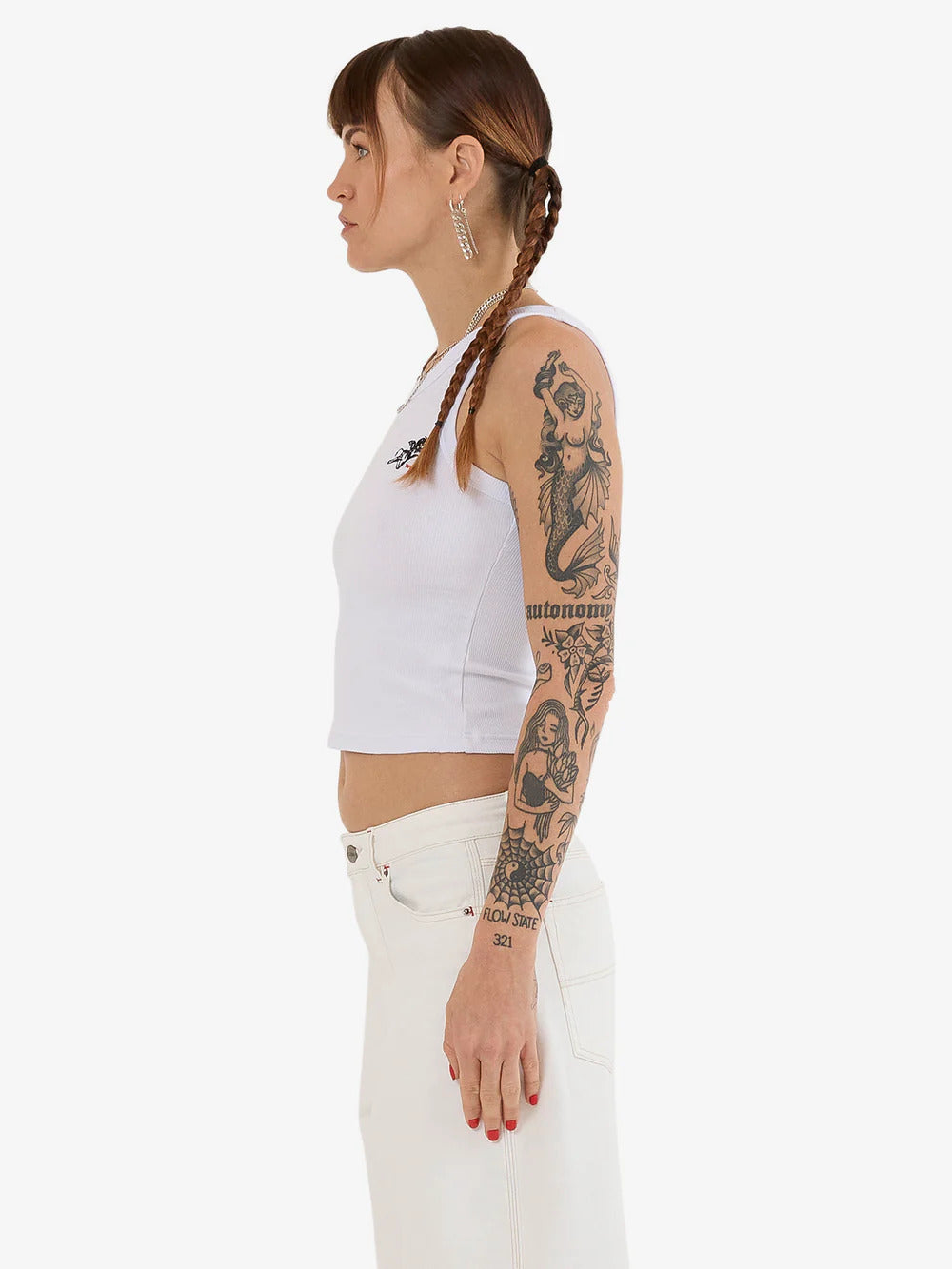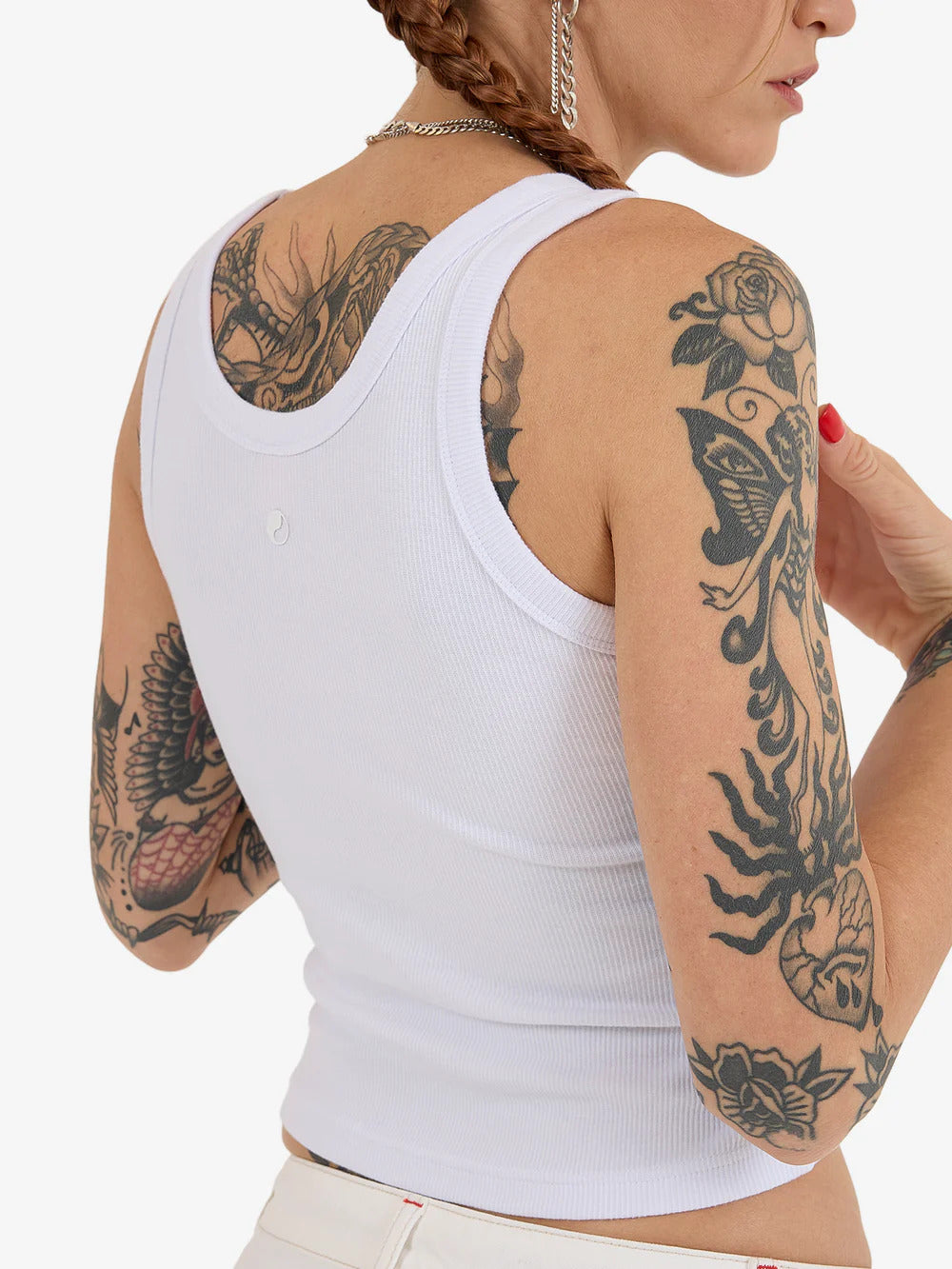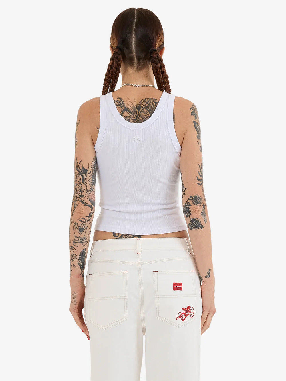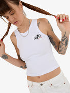 - Designed for comfort and style, the Cherub Longline Tank in White is crafted from a soft blend of cotton and elastane. This ribbed tank features a sleek silhouette with just the right stretch for a fitted finish. Designed with a subtle cherub graphic detail on the chest, a slightly cropped cut, and a comfy sleeveless design.